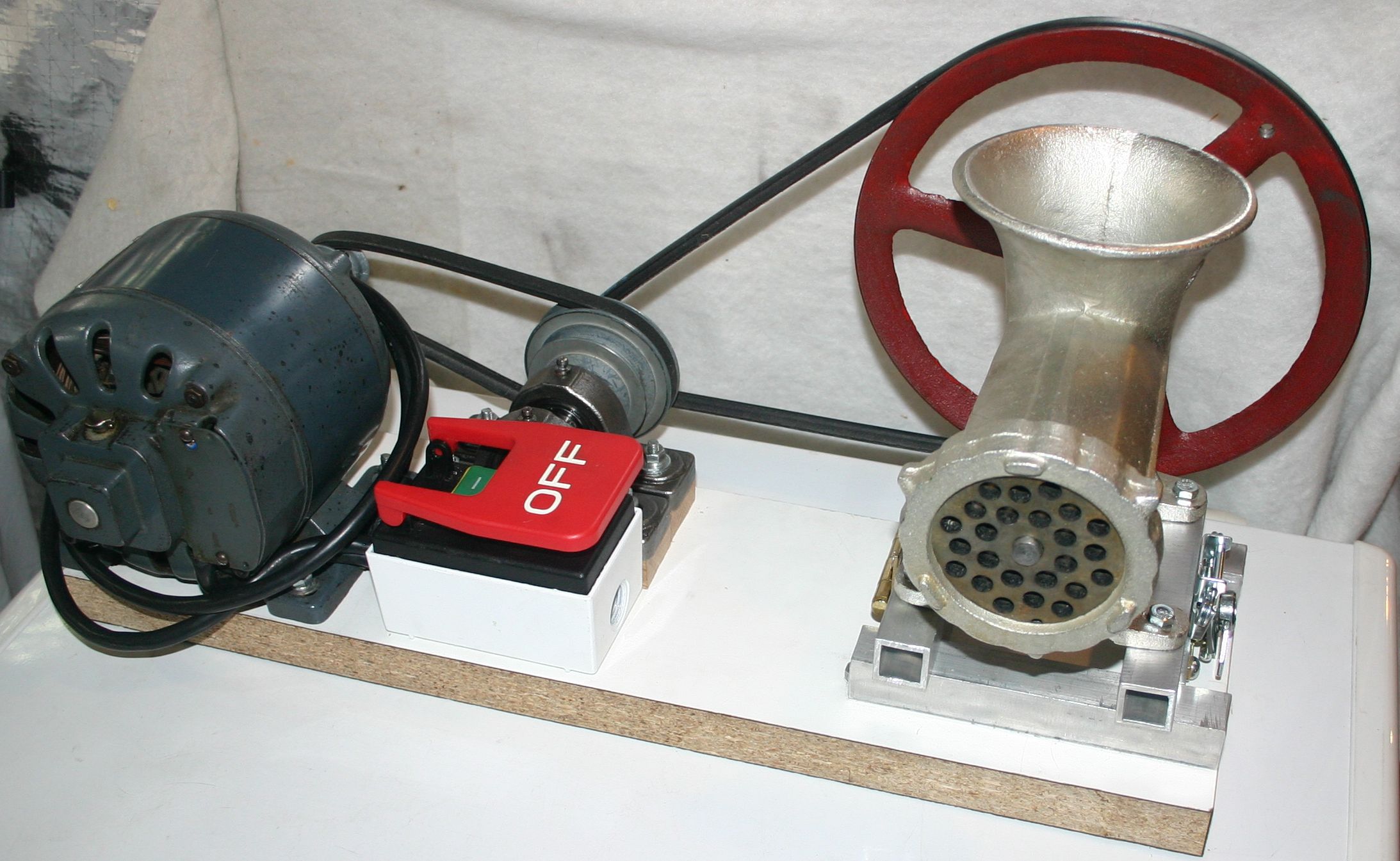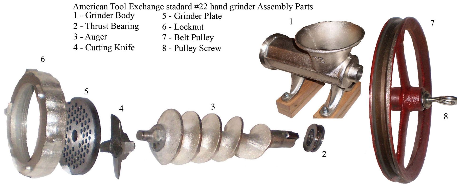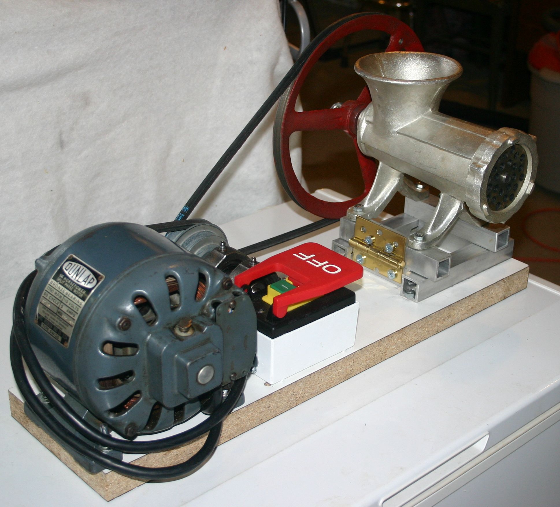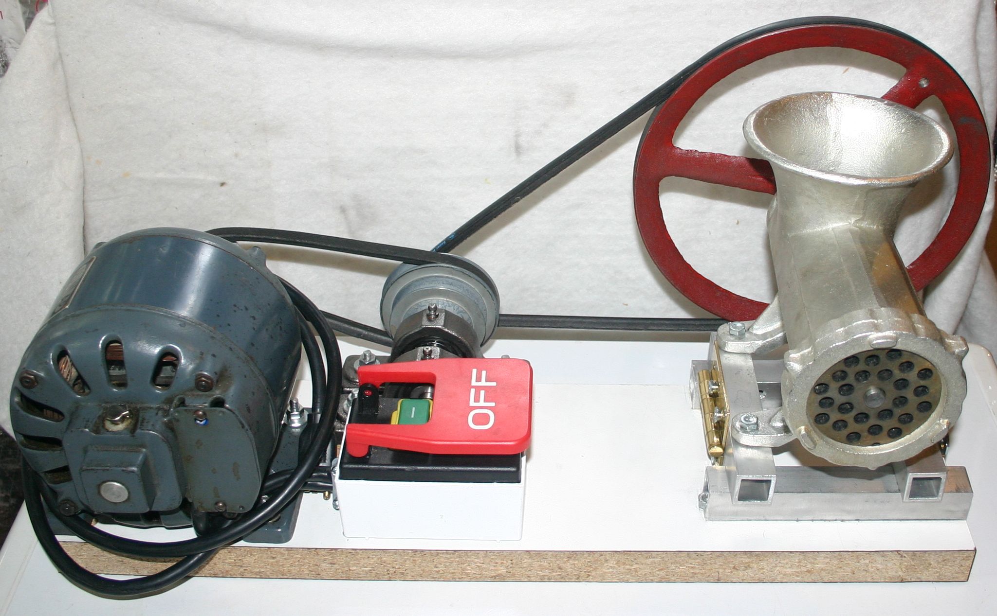 American Tool Exchange #22 hand meat grinder, (no longer available) or this Substitute #22 hand meat grinder, to a compact, (1/4 HP) motorized grinder. It grinds at the rate of five (5) pounds a minute, hour after hour, and, because of the ball-bearing speed brake, it is very quiet and vibrationless. The speed brake reduces the motor speed of 1,725 rpm to a grinder speed of about 75 rpm. The base is 1" press board, so that the platform will not "flex" during operation, thus preventing belt slippage. The V-belts are tensioned not too tight, however, so that they will slip if you hit a chunk of bone, instead of breaking a grinder part — the motor mount is slotted, and the main base beneath the grinder mounts is slotted, allowing them to slide for proper V-belt tensioning. The American Tool grinder comes with a 3L & O-Section, 10" flywheel — The design below uses 1/4 hp,1725 RPM motor and a speed break. It's a machine that should last 100 years. |