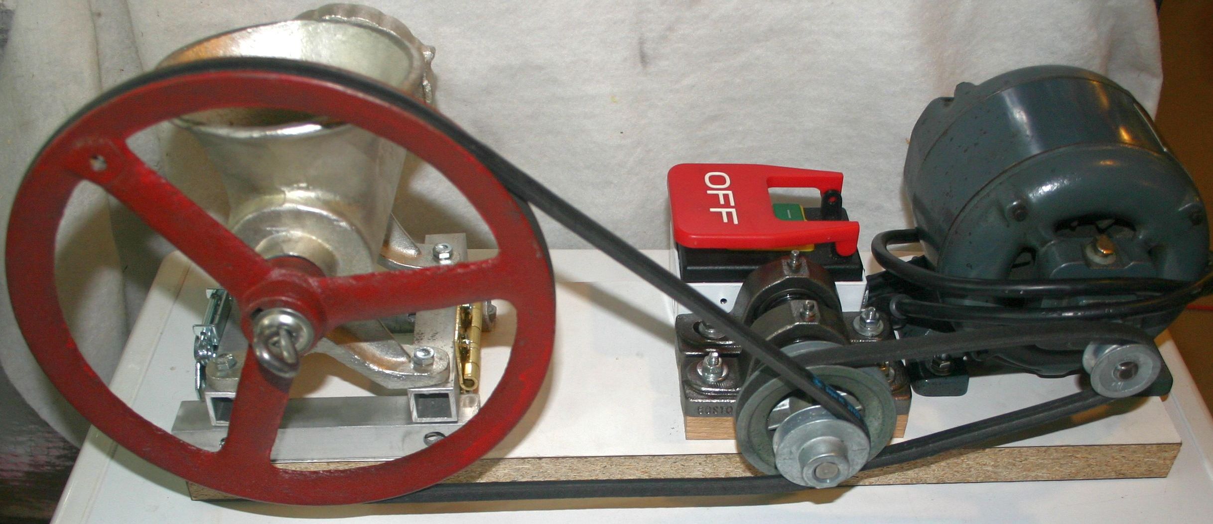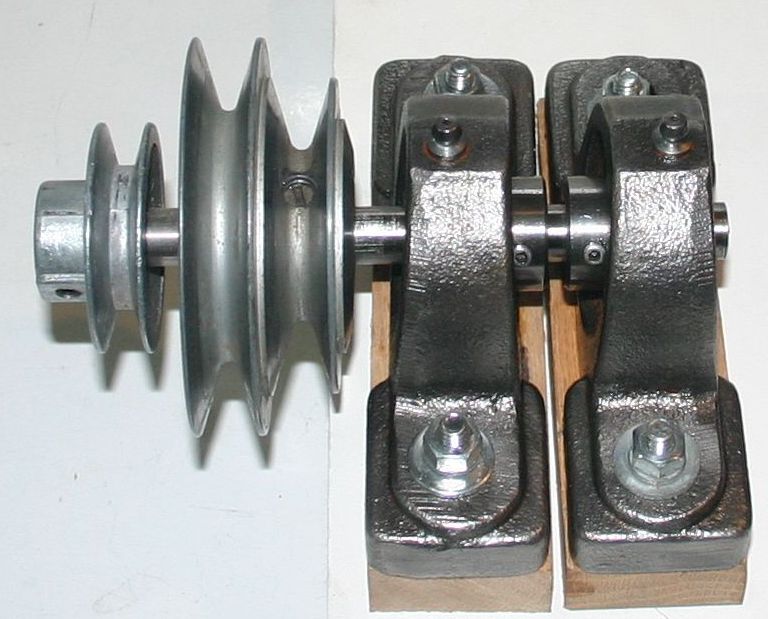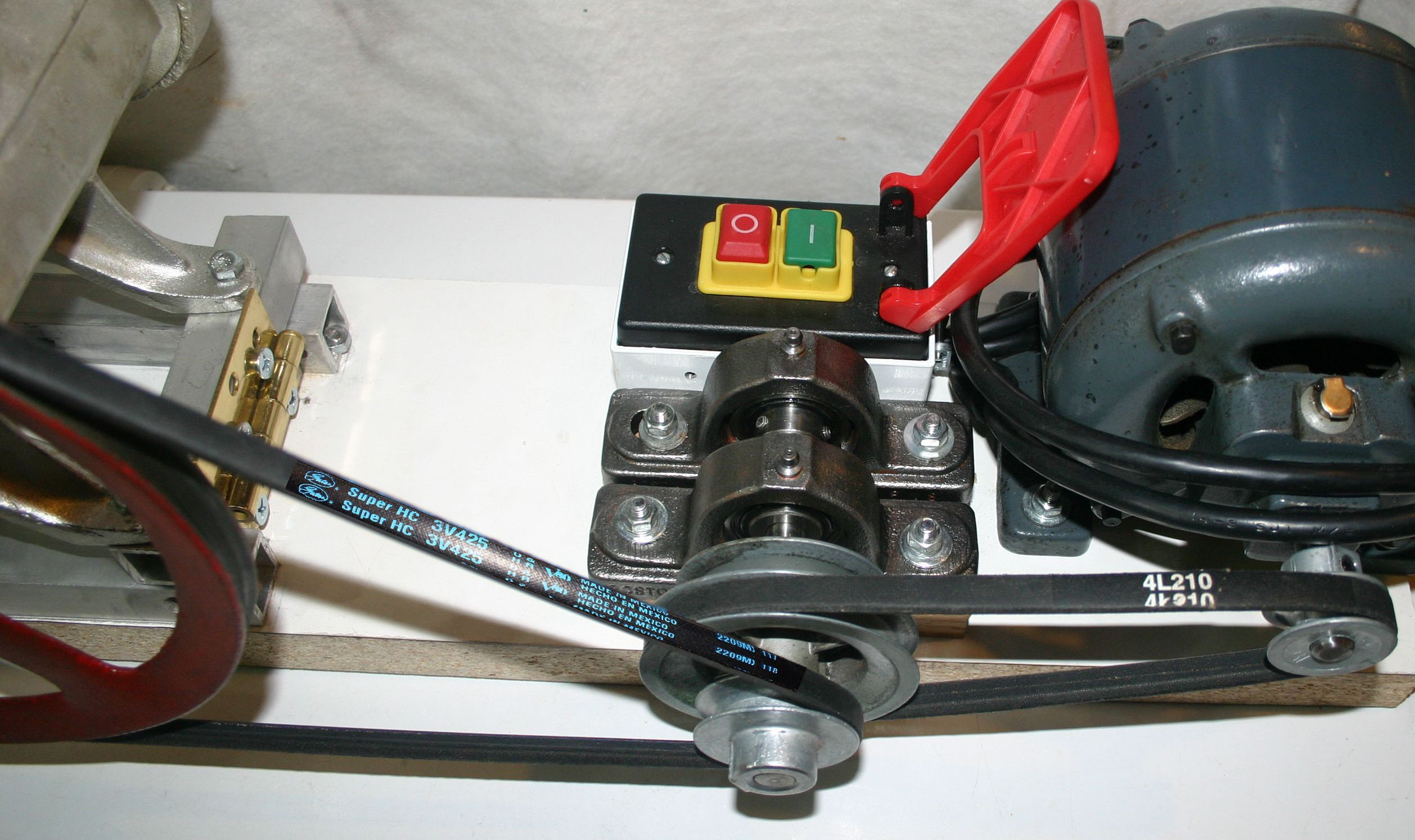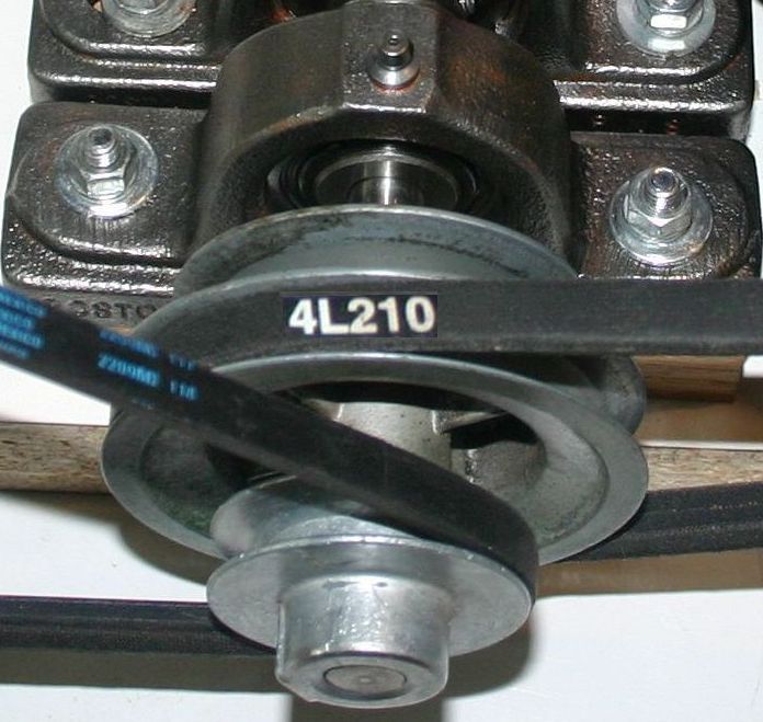 Motor shaft Pulley = Die Cast 150A 1/2 by 1 1/2" V Belt Pulley; McMaster Carr 6245k11 Large speed brake pulley = Chicago Die Casting 400A 1/2 by 4" V Belt Pulley; McMaster Carr 6245k38 Small speed brake pulley = Die Cast 3L & O-Section, 2" OD, 1/2" Bore McMaster Carr 6245K514 Grinder flywheel pulley = 3L & O-Section 10" comes with grinder. Motor to speed brake V-belt = 1/2 x 21 V Belt 4L210, McMaster Carr 6191K97 Speed brake to grinder V-belt = 3V-Section Rubber Wedge V-Belt, Trade Size 3v425, 42.5" Outer Circle, 21/64" Height. McMaster Carr 6230K21 This reduces the 1725 RPM of the motor to about 75 RPM at the grinder. Note: zerk grease fittings for the bearings. |
